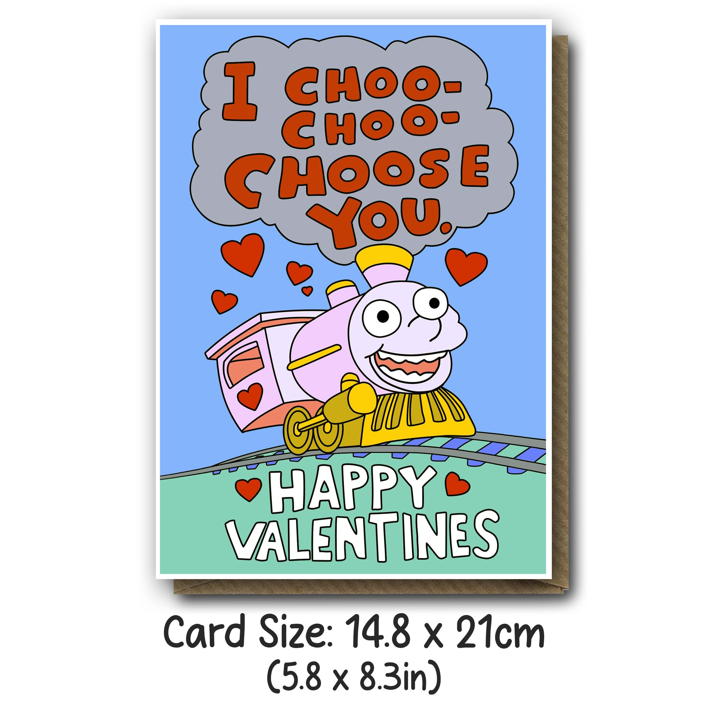 Cute valentines day card the perfect gift for your boyfriend, girlfriend, partner or husband wife this valentine day. This card features a train with the words I choo choo choose you coming from its engine steam. Size 14.8 X 21cm. Printed on thick 350gsm card and supplied with a free envelope for sending on to your loved one. Designed and printed in the United Kingdom.