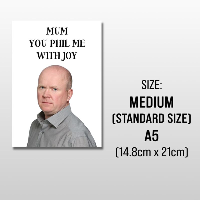 This card features Phil Mitchell from the popular tv soap “Eastenders”. Cute card sure to give your mother a smile on mothers day. Size 14.8cm x 21cm. Printed on thick 350gsm card and supplied with a free envelope for sending on to your loved one. Designed and printed in the United Kingdom.